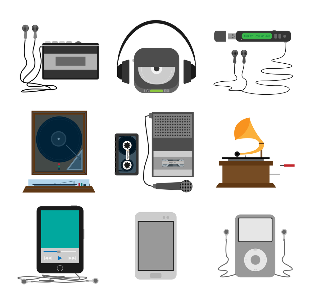 Following Musicplayer Illustrations are included: Audio Casset Player, CD Player, Gramophone, IpodTouch, Ipod, Mp3 Player, Vinyl Player, Walkman & Smartphone